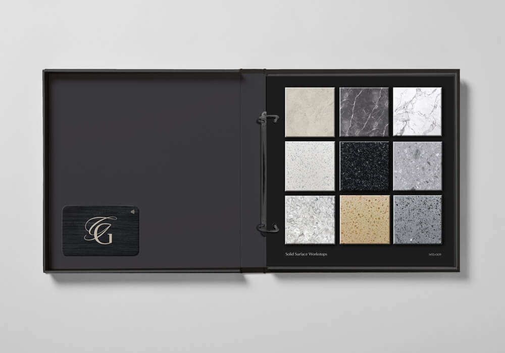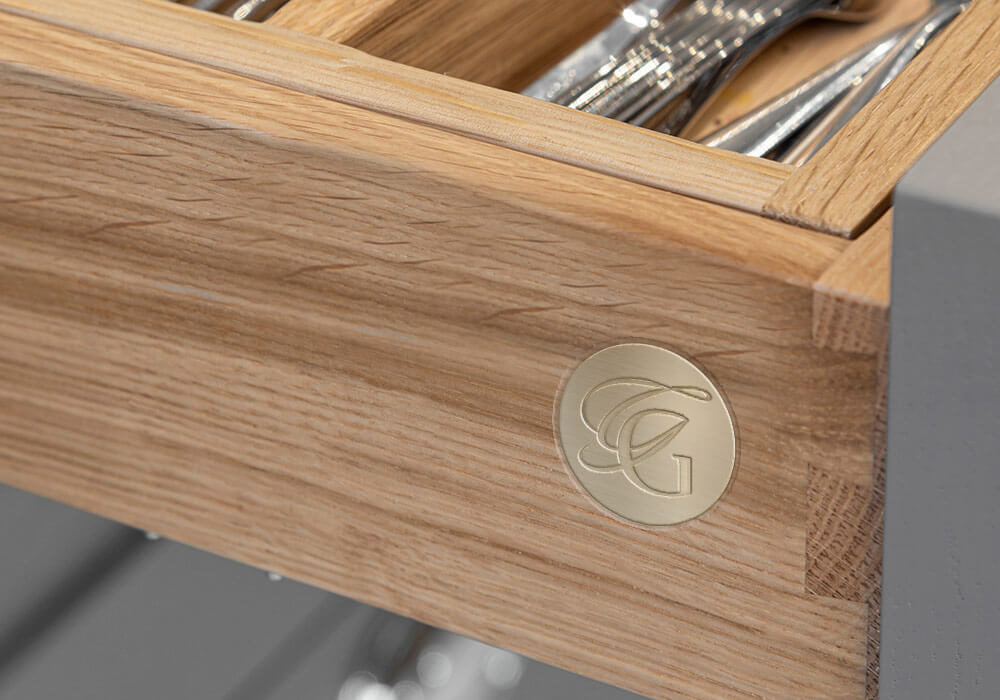 The brand icon developed as part of the luxury brand identity was created with a variety of uses and applications in mind, one of these being a Grech & Grech ‘seal of approval’ badge. Made from brushed metal it appears as a hallmark of quality concealed within every tailor-made Grech & Grech kitchen. Because the brand icon was to have many uses, three variants were designed as part of the luxury brand identity, to be used interchangeably depending on a specific substrate and application.